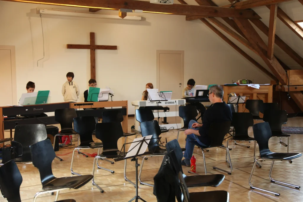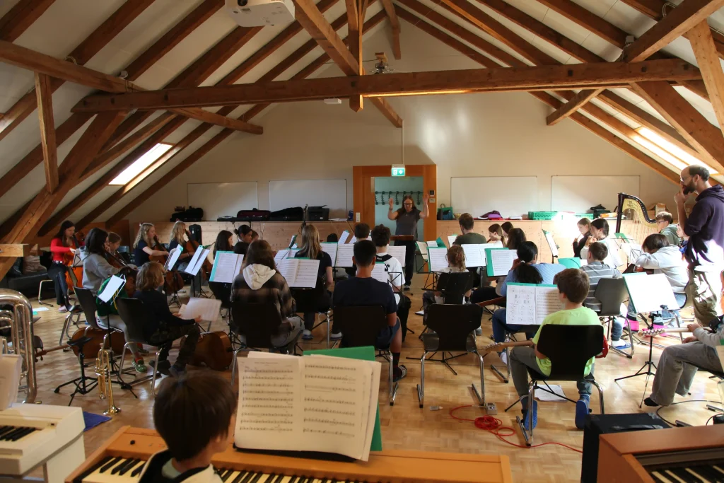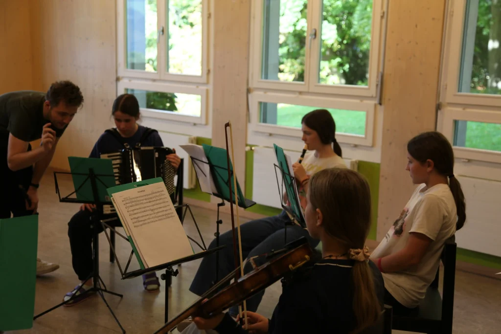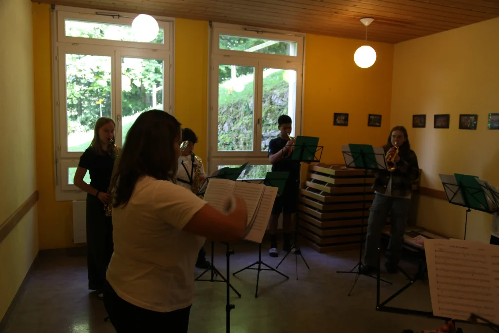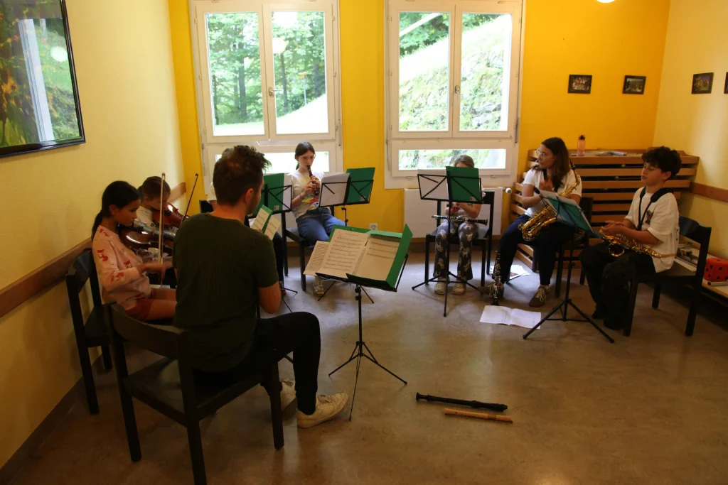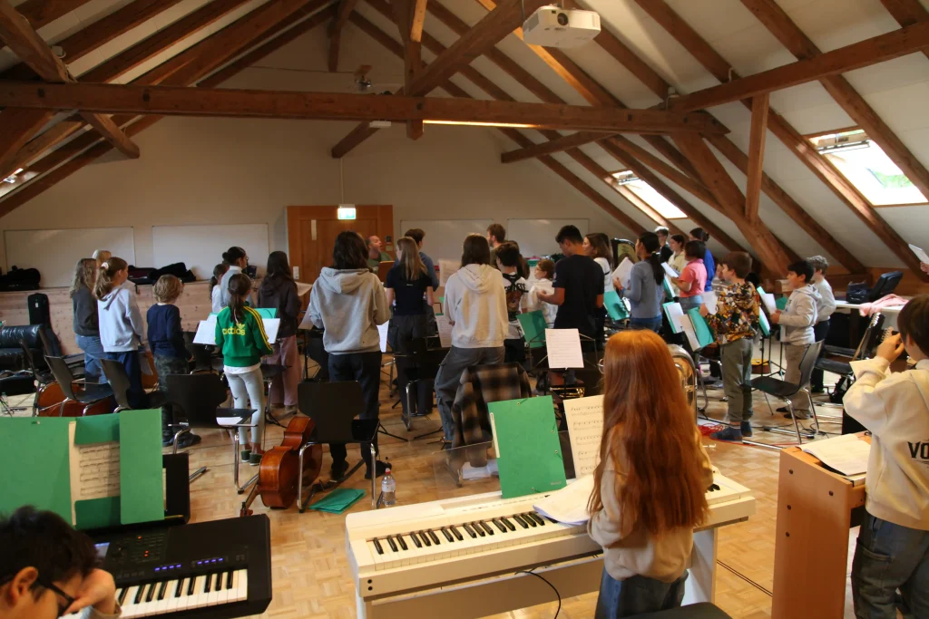 Eh Eho Eho, so tönte es um 07:30 aus dem Gang vor den Zimmern. Mit Pompeii von Bastille und anderen Liedern, wurde der erste Tag des Musiklagers gestartet. Mit einer Rekord-Anzahl von 24 Personen beim Morgensport wurde der noch müde Körper und Geist geweckt und für den Tag vorbereitet. Nach einem ausgiebigen Morgenessen, wurde dann erst mal mit einer Runde Gesang in die Musikblöcke gestartet.
