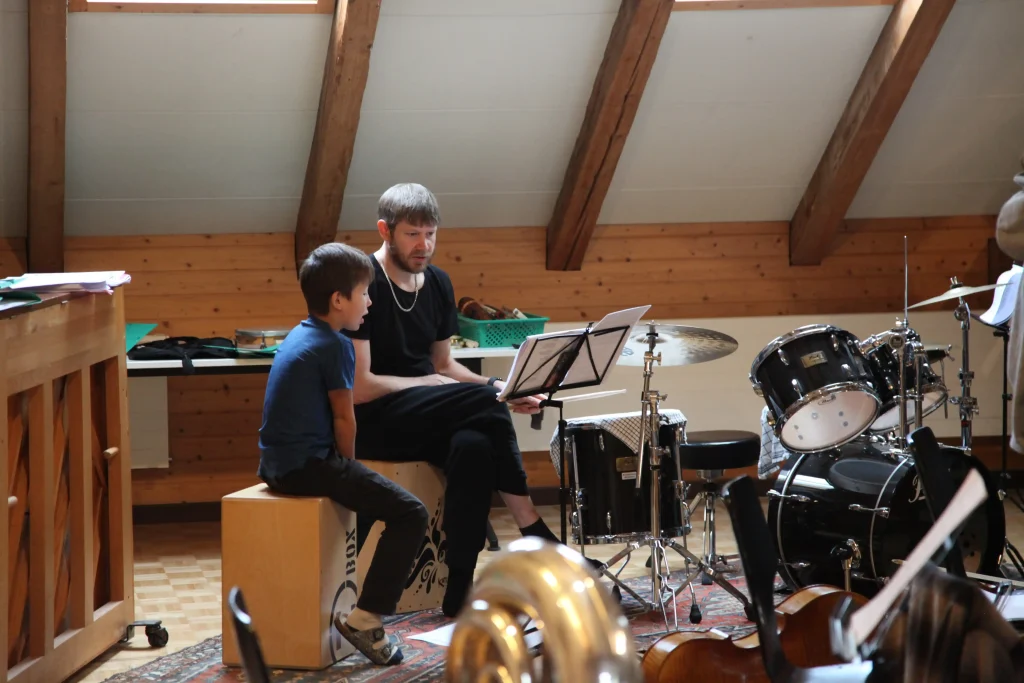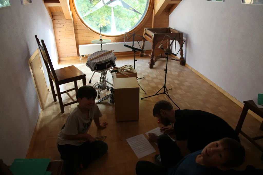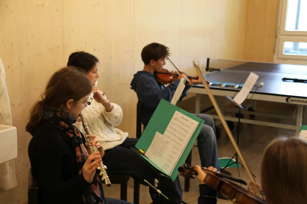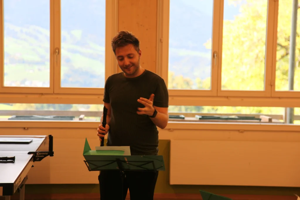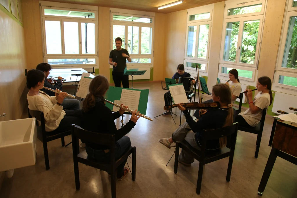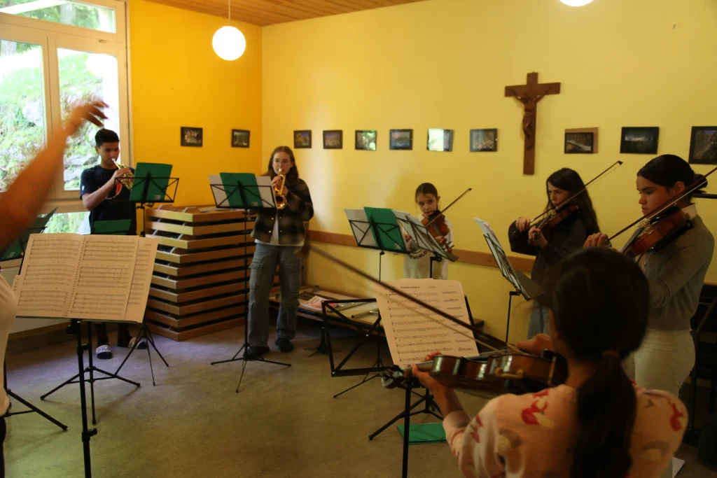 Eh Eho Eho, so tönte es um 07:30 aus dem Gang vor den Zimmern. Mit Pompeii von Bastille und anderen Liedern, wurde der erste Tag des Musiklagers gestartet. Mit einer Rekord-Anzahl von 24 Personen beim Morgensport wurde der noch müde Körper und Geist geweckt und für den Tag vorbereitet. Nach einem ausgiebigen Morgenessen, wurde dann erst mal mit einer Runde Gesang in die Musikblöcke gestartet.