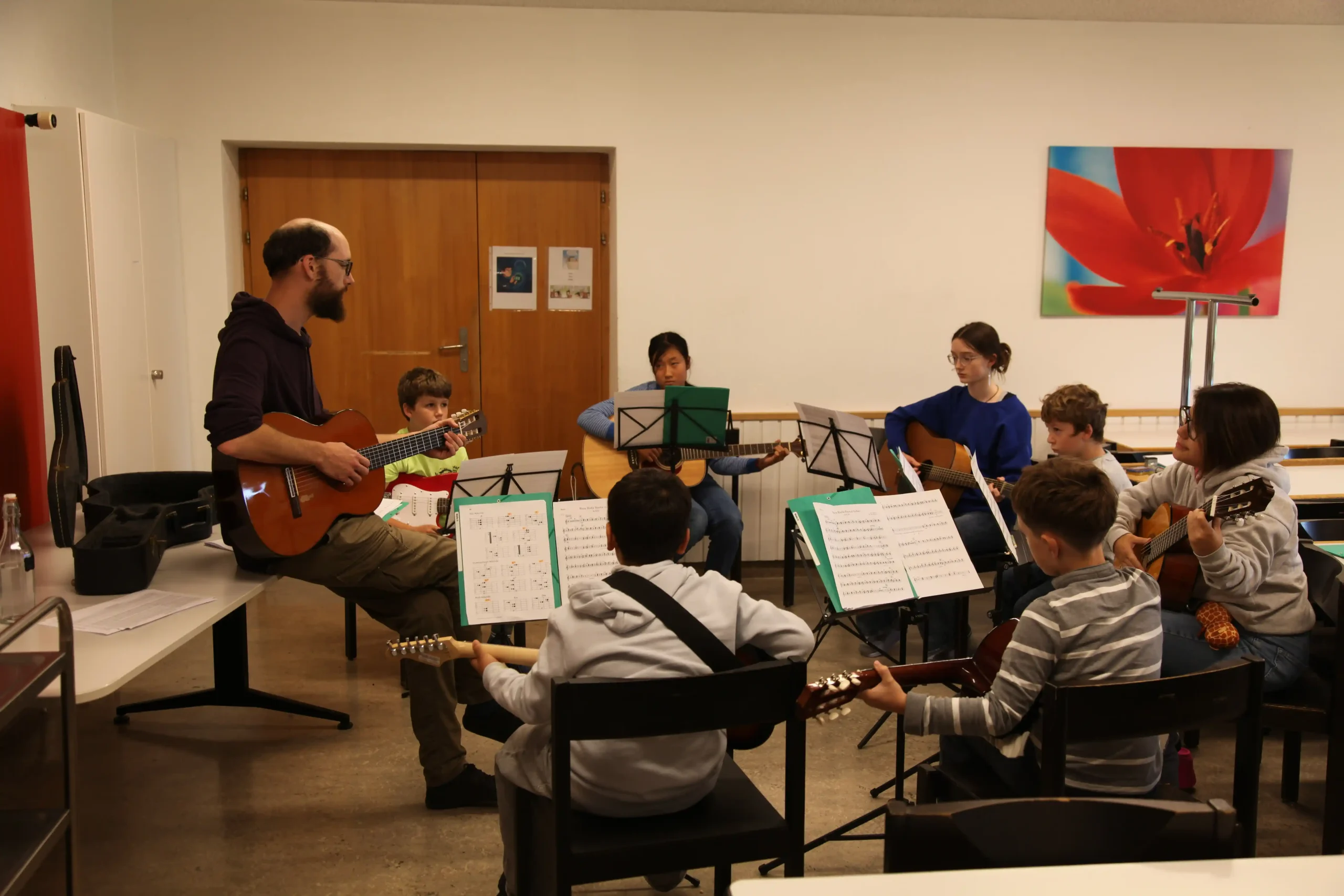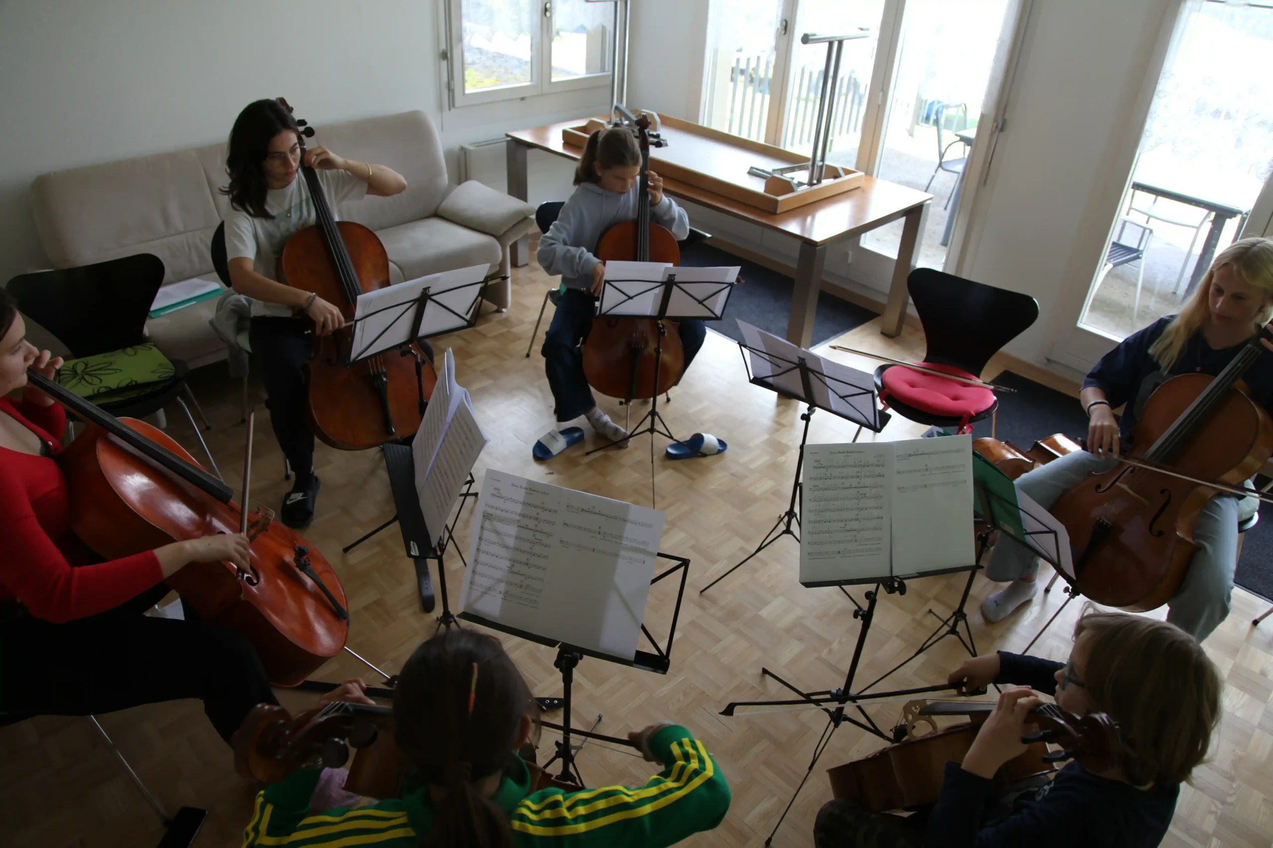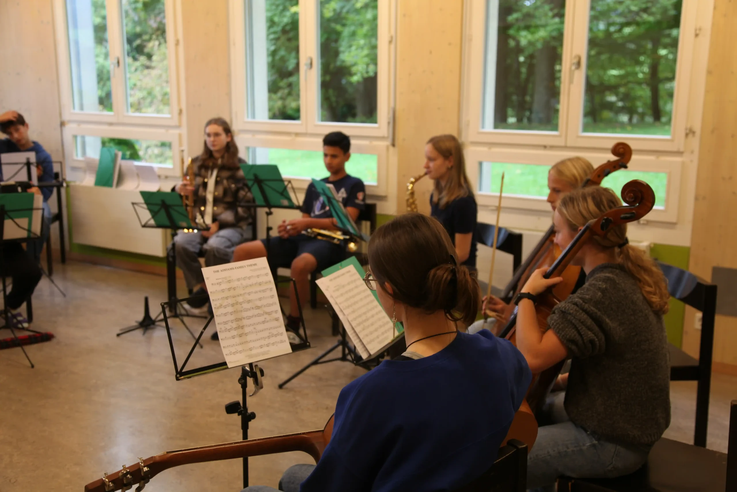 Eh Eho Eho, so tönte es um 07:30 aus dem Gang vor den Zimmern. Mit Pompeii von Bastille und anderen Liedern, wurde der erste Tag des Musiklagers gestartet. Mit einer Rekord-Anzahl von 24 Personen beim Morgensport wurde der noch müde Körper und Geist geweckt und für den Tag vorbereitet. Nach einem ausgiebigen Morgenessen, wurde dann erst mal mit einer Runde Gesang in die Musikblöcke gestartet.