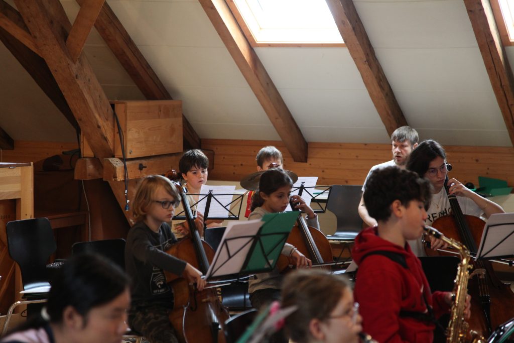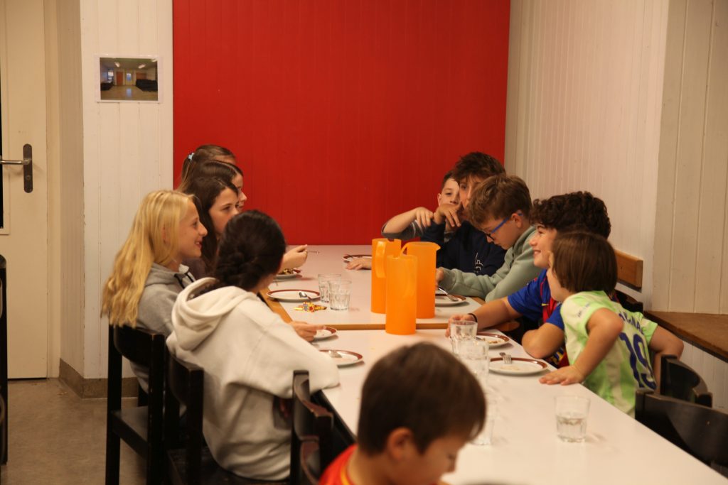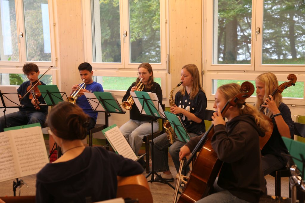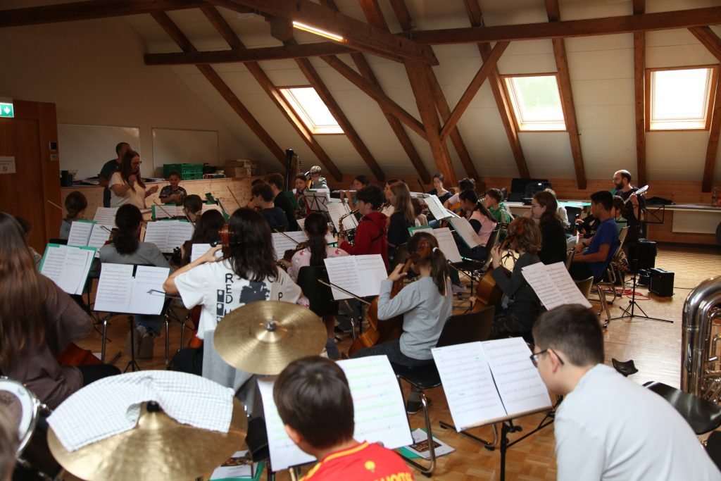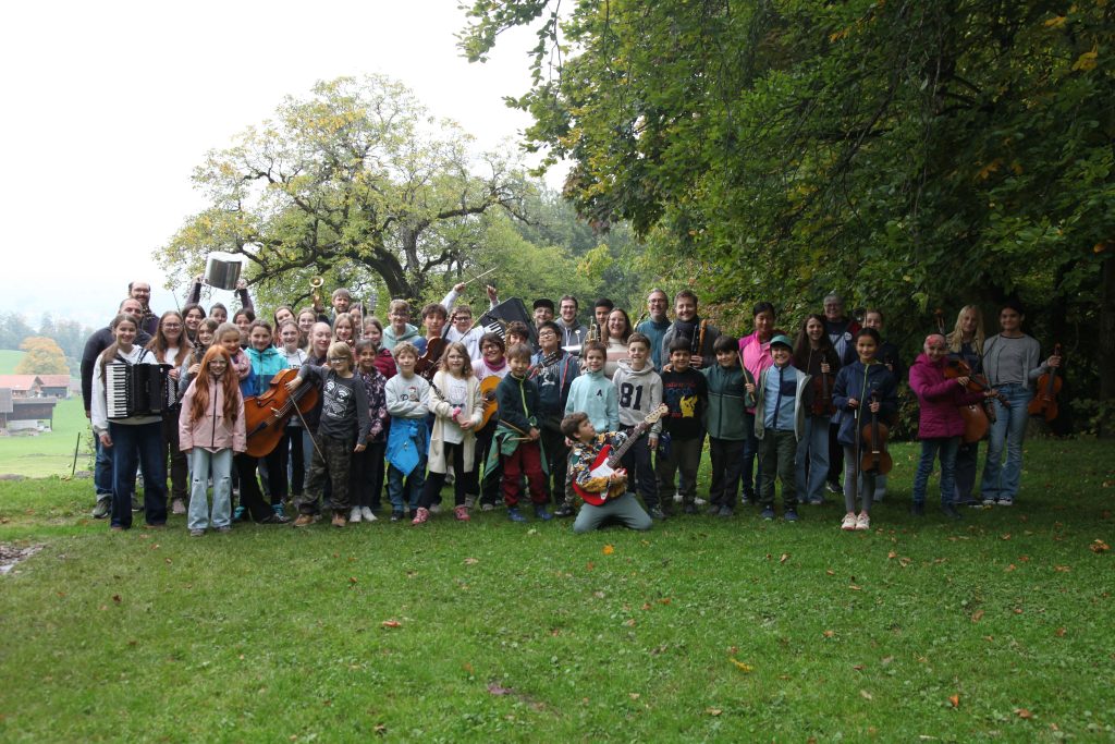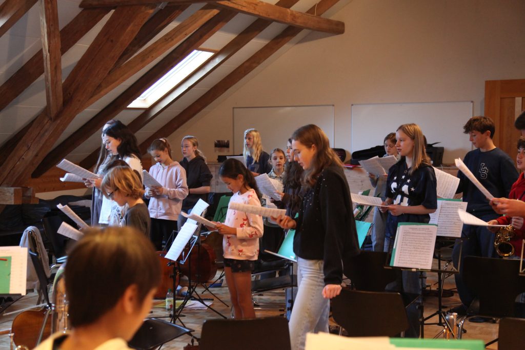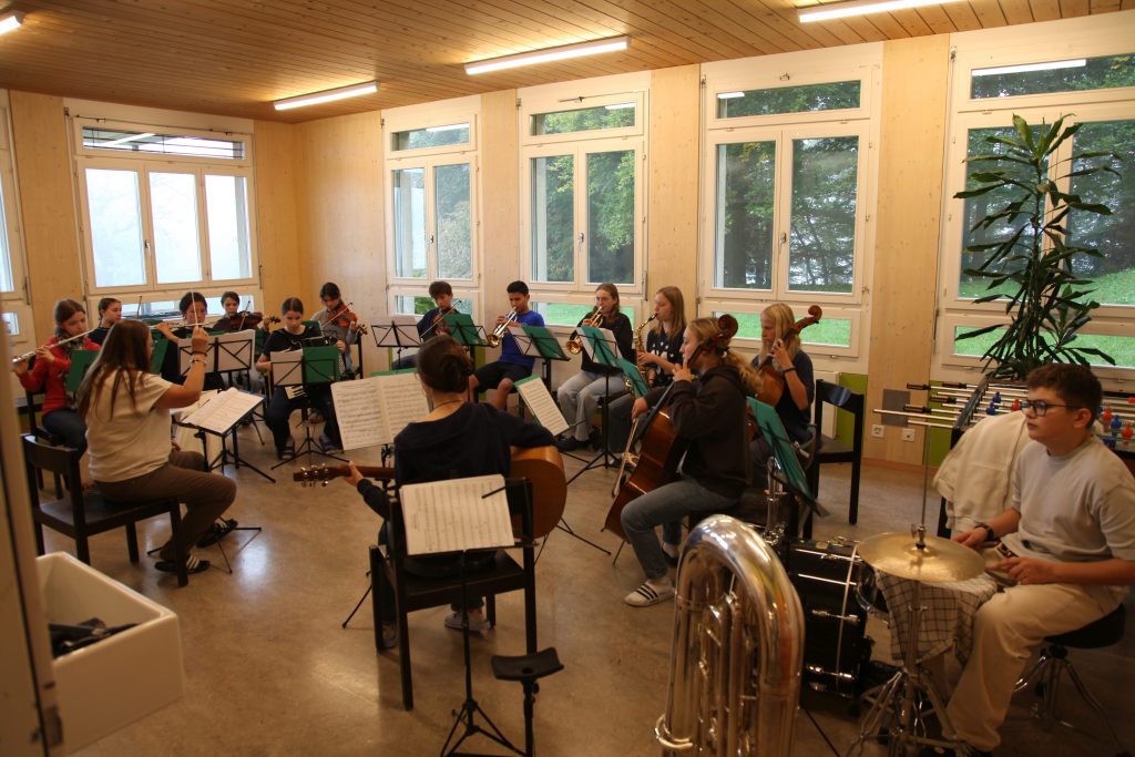 Wie gewohnt um 07:30 ertönte in den Gängen „laute“ Musik. Mit Final Countdown traf sich die 5-köpfige Morgensporttruppe vor dem Haus. Nach dem aufwärmen bevor verschiedene Spiele gespielt wurden, wurde auch „Barti“ die Chef-Ziege und seine Freunde begrüsst. Der musikalische Anfang der Probe wurde wieder mit verschiedenen Songs gestartet bevor die gestern in den Registern erprobten instrumentalen Stücke gemeinsam erarbeitet wurden. Es fügt sich langsam alles zusammen (ihr könnt euch auf den Samstag freuen!). Beim Mittagessen wurden wir mit Kartoffelstock und Fleisch- bzw. Gemüsebällchen verwöhnt. nach der Mittagspause versammelten wir uns mit unseren Instrumenten draussen für das Lagerfoto. Anschliessend gingen wir dann auf einen kleinen Ausflug Richtung Fluss. Auf dem Weg konnten wir die Unterkunft von Bruder Klaus und die Kapelle von Flüeli-Ranft ansehen. Am Fluss wurde dann fleissig Steine gestapelt und herumbalanciert (fast alle blieben trocken). Natürlich durfte auch der Besuch im Kiosk nicht fehlen um Snacks oder Souvenirs zu kaufen. Bis zum Abendessen wurde dann noch fleissig geübt oder Ping-Pong gespielt. Und nicht zu vergessen die ersehnte Handyzeit. Mit einer riesigen Auswahl an Grilliertem und zwei verschiedenen selbstgemachten Tiramisus wurden unsere Bäuche dann beim Abendessen bis oben gefüllt. Danach war der Abend offen für verschiedene Brettspiele, Uno oder Poker. Nachdem das Casino bankrott war, hat man sich dann auch schon wieder für die Nachtruhe vorbereitet. Morgen freuen wir uns auf den zweitletzten Tag des Musiklagers, wieder mit 4 Blöcken Musik.