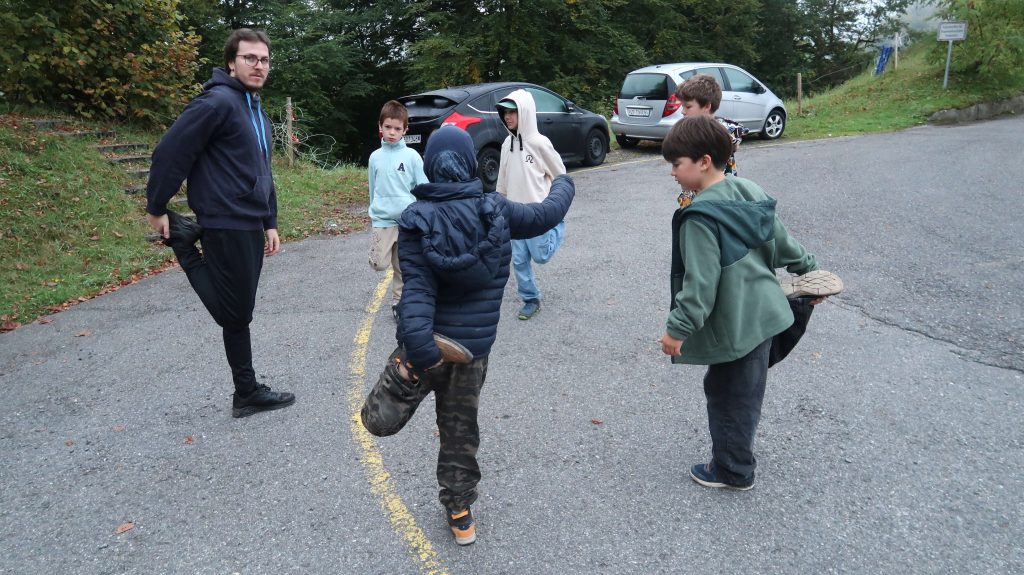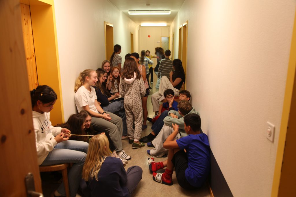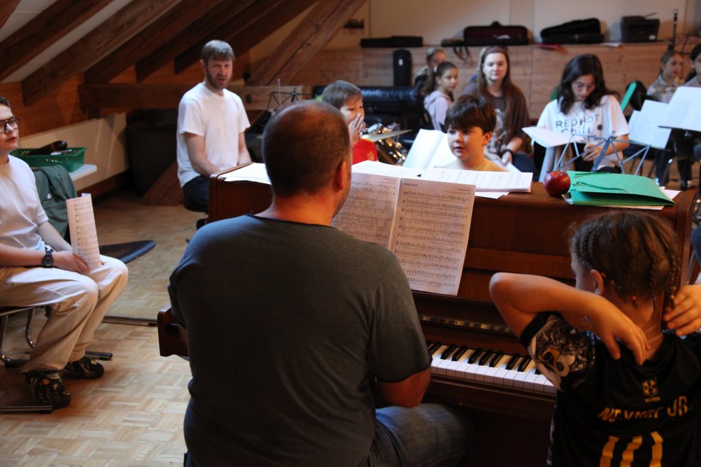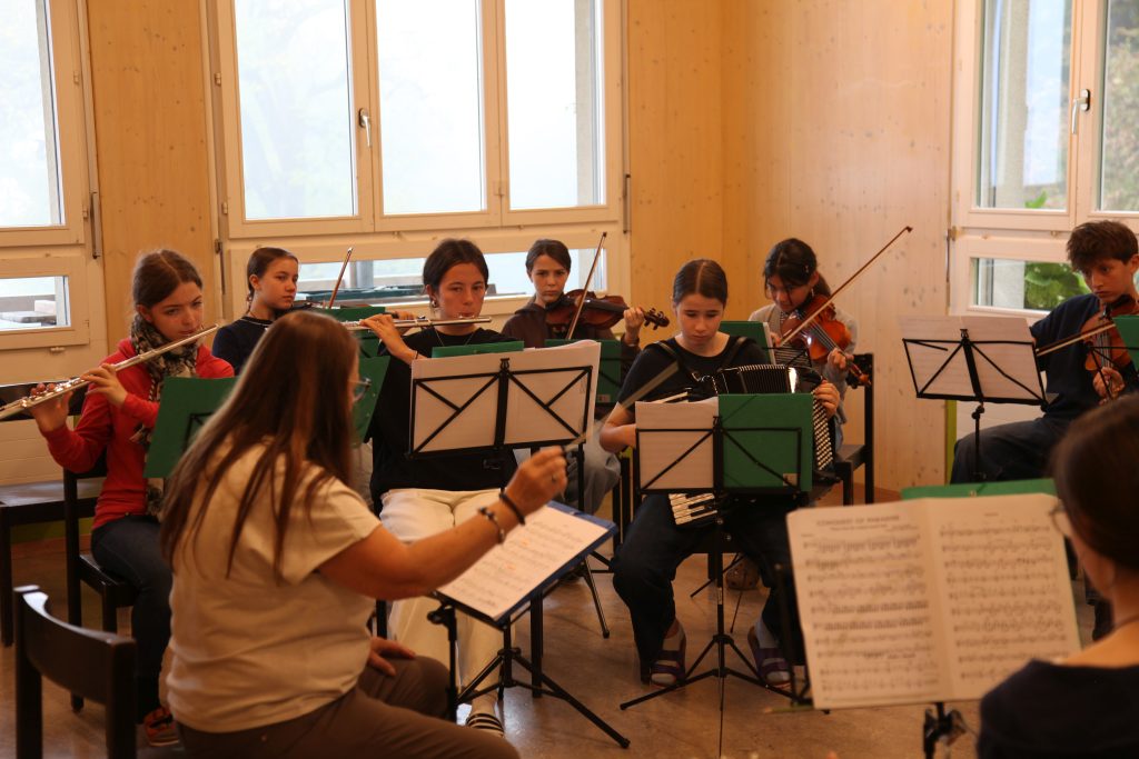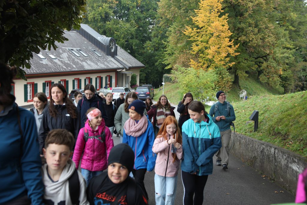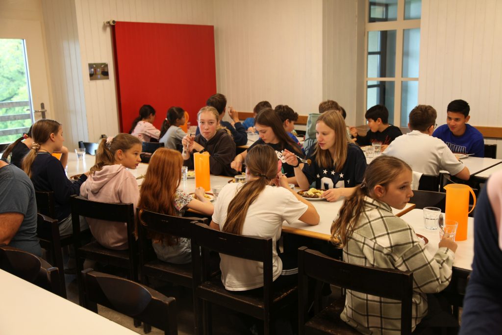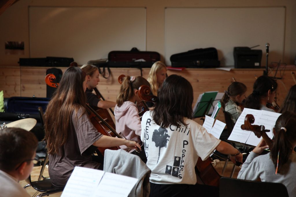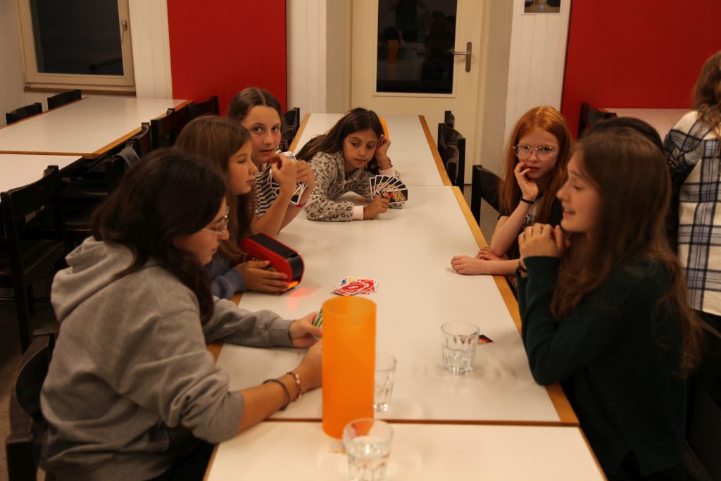 Wie gewohnt um 07:30 ertönte in den Gängen „laute“ Musik. Mit Final Countdown traf sich die 5-köpfige Morgensporttruppe vor dem Haus. Nach dem aufwärmen bevor verschiedene Spiele gespielt wurden, wurde auch „Barti“ die Chef-Ziege und seine Freunde begrüsst. Der musikalische Anfang der Probe wurde wieder mit verschiedenen Songs gestartet bevor die gestern in den Registern erprobten instrumentalen Stücke gemeinsam erarbeitet wurden. Es fügt sich langsam alles zusammen (ihr könnt euch auf den Samstag freuen!). Beim Mittagessen wurden wir mit Kartoffelstock und Fleisch- bzw. Gemüsebällchen verwöhnt. nach der Mittagspause versammelten wir uns mit unseren Instrumenten draussen für das Lagerfoto. Anschliessend gingen wir dann auf einen kleinen Ausflug Richtung Fluss. Auf dem Weg konnten wir die Unterkunft von Bruder Klaus und die Kapelle von Flüeli-Ranft ansehen. Am Fluss wurde dann fleissig Steine gestapelt und herumbalanciert (fast alle blieben trocken). Natürlich durfte auch der Besuch im Kiosk nicht fehlen um Snacks oder Souvenirs zu kaufen. Bis zum Abendessen wurde dann noch fleissig geübt oder Ping-Pong gespielt. Und nicht zu vergessen die ersehnte Handyzeit. Mit einer riesigen Auswahl an Grilliertem und zwei verschiedenen selbstgemachten Tiramisus wurden unsere Bäuche dann beim Abendessen bis oben gefüllt. Danach war der Abend offen für verschiedene Brettspiele, Uno oder Poker. Nachdem das Casino bankrott war, hat man sich dann auch schon wieder für die Nachtruhe vorbereitet. Morgen freuen wir uns auf den zweitletzten Tag des Musiklagers, wieder mit 4 Blöcken Musik.