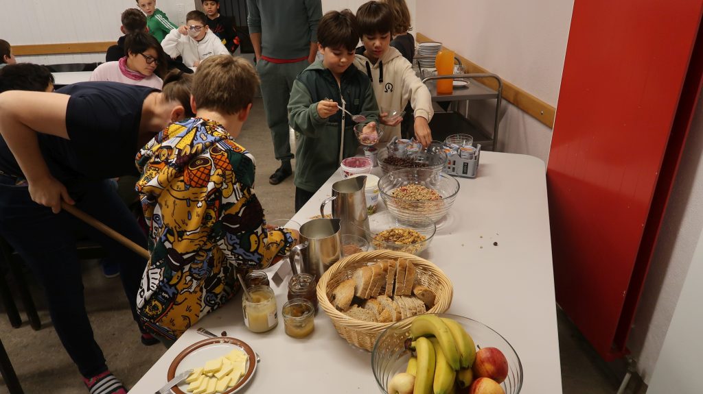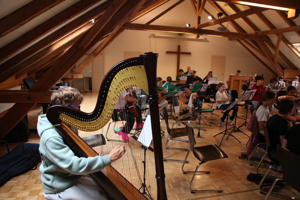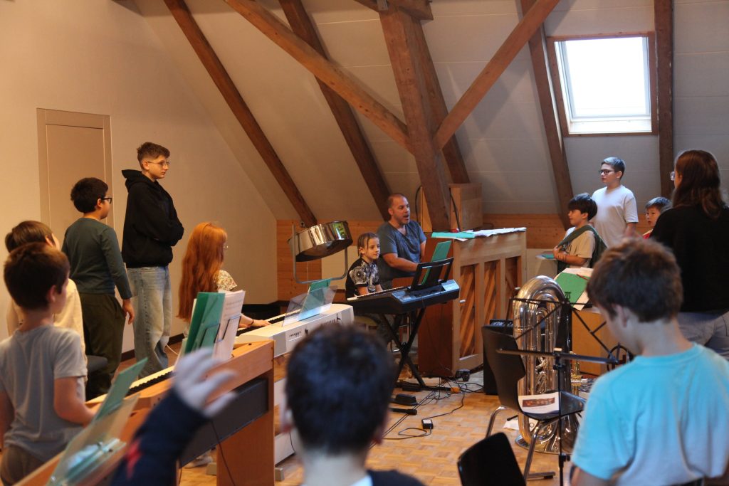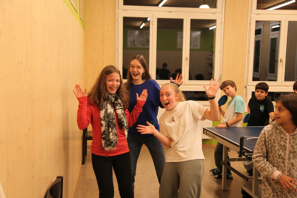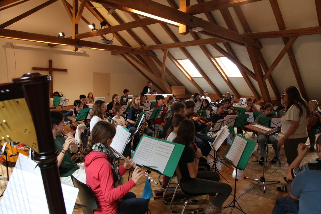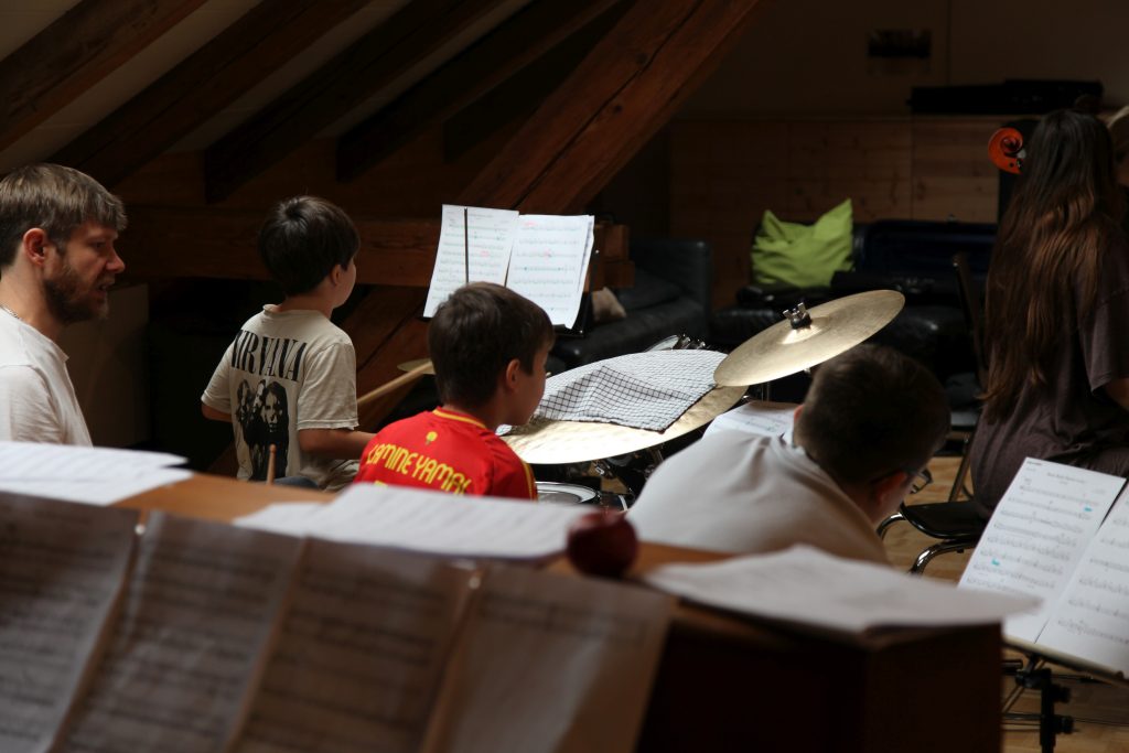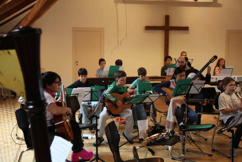 Wie gewohnt um 07:30 ertönte in den Gängen „laute“ Musik. Mit Final Countdown traf sich die 5-köpfige Morgensporttruppe vor dem Haus. Nach dem aufwärmen bevor verschiedene Spiele gespielt wurden, wurde auch „Barti“ die Chef-Ziege und seine Freunde begrüsst. Der musikalische Anfang der Probe wurde wieder mit verschiedenen Songs gestartet bevor die gestern in den Registern erprobten instrumentalen Stücke gemeinsam erarbeitet wurden. Es fügt sich langsam alles zusammen (ihr könnt euch auf den Samstag freuen!). Beim Mittagessen wurden wir mit Kartoffelstock und Fleisch- bzw. Gemüsebällchen verwöhnt. nach der Mittagspause versammelten wir uns mit unseren Instrumenten draussen für das Lagerfoto. Anschliessend gingen wir dann auf einen kleinen Ausflug Richtung Fluss. Auf dem Weg konnten wir die Unterkunft von Bruder Klaus und die Kapelle von Flüeli-Ranft ansehen. Am Fluss wurde dann fleissig Steine gestapelt und herumbalanciert (fast alle blieben trocken). Natürlich durfte auch der Besuch im Kiosk nicht fehlen um Snacks oder Souvenirs zu kaufen. Bis zum Abendessen wurde dann noch fleissig geübt oder Ping-Pong gespielt. Und nicht zu vergessen die ersehnte Handyzeit. Mit einer riesigen Auswahl an Grilliertem und zwei verschiedenen selbstgemachten Tiramisus wurden unsere Bäuche dann beim Abendessen bis oben gefüllt. Danach war der Abend offen für verschiedene Brettspiele, Uno oder Poker. Nachdem das Casino bankrott war, hat man sich dann auch schon wieder für die Nachtruhe vorbereitet. Morgen freuen wir uns auf den zweitletzten Tag des Musiklagers, wieder mit 4 Blöcken Musik.