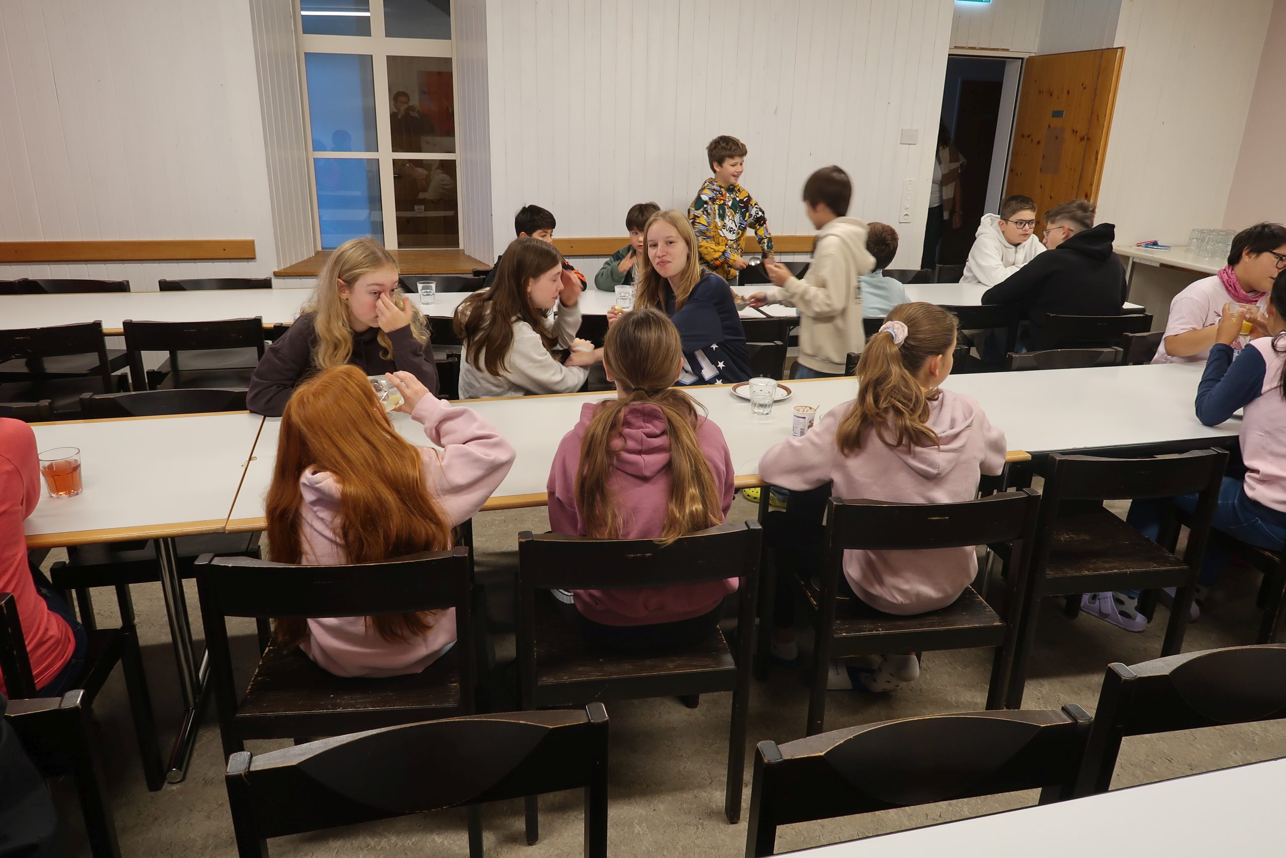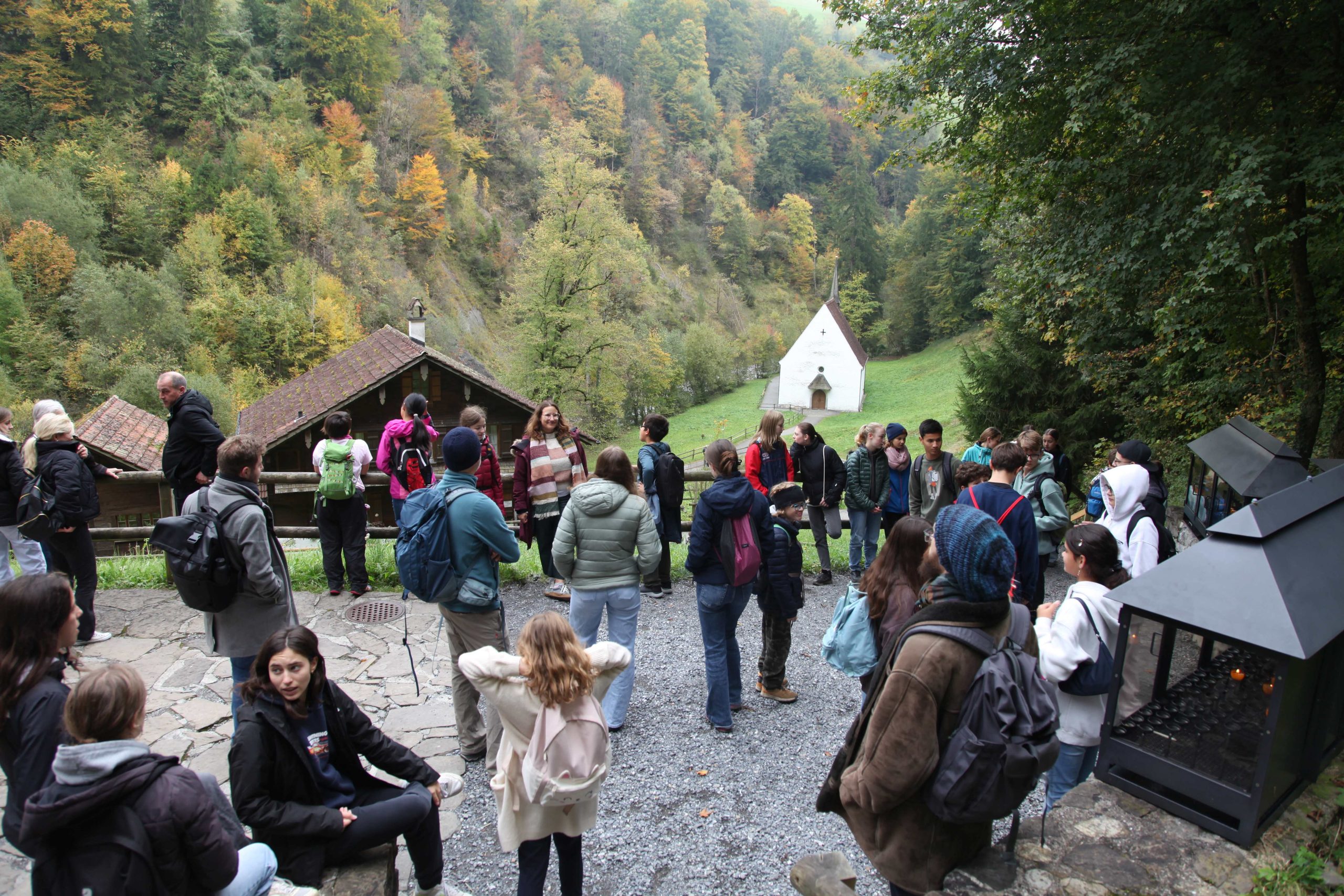 Wie gewohnt um 07:30 ertönte in den Gängen „laute“ Musik. Mit Final Countdown traf sich die 5-köpfige Morgensporttruppe vor dem Haus. Nach dem aufwärmen bevor verschiedene Spiele gespielt wurden, wurde auch „Barti“ die Chef-Ziege und seine Freunde begrüsst. Der musikalische Anfang der Probe wurde wieder mit verschiedenen Songs gestartet bevor die gestern in den Registern erprobten instrumentalen Stücke gemeinsam erarbeitet wurden. Es fügt sich langsam alles zusammen (ihr könnt euch auf den Samstag freuen!). Beim Mittagessen wurden wir mit Kartoffelstock und Fleisch- bzw. Gemüsebällchen verwöhnt. nach der Mittagspause versammelten wir uns mit unseren Instrumenten draussen für das Lagerfoto. Anschliessend gingen wir dann auf einen kleinen Ausflug Richtung Fluss. Auf dem Weg konnten wir die Unterkunft von Bruder Klaus und die Kapelle von Flüeli-Ranft ansehen. Am Fluss wurde dann fleissig Steine gestapelt und herumbalanciert (fast alle blieben trocken). Natürlich durfte auch der Besuch im Kiosk nicht fehlen um Snacks oder Souvenirs zu kaufen. Bis zum Abendessen wurde dann noch fleissig geübt oder Ping-Pong gespielt. Und nicht zu vergessen die ersehnte Handyzeit. Mit einer riesigen Auswahl an Grilliertem und zwei verschiedenen selbstgemachten Tiramisus wurden unsere Bäuche dann beim Abendessen bis oben gefüllt. Danach war der Abend offen für verschiedene Brettspiele, Uno oder Poker. Nachdem das Casino bankrott war, hat man sich dann auch schon wieder für die Nachtruhe vorbereitet. Morgen freuen wir uns auf den zweitletzten Tag des Musiklagers, wieder mit 4 Blöcken Musik.