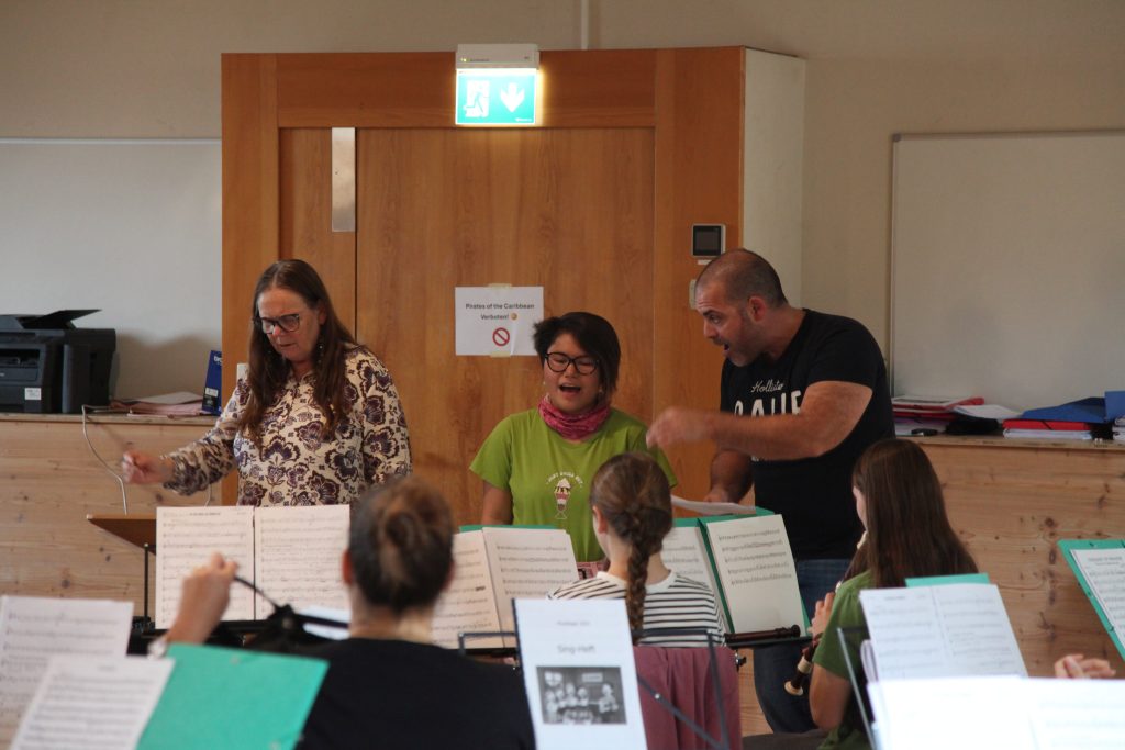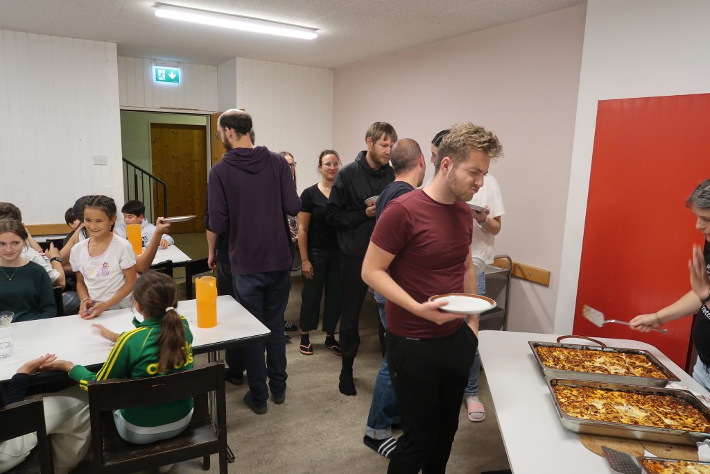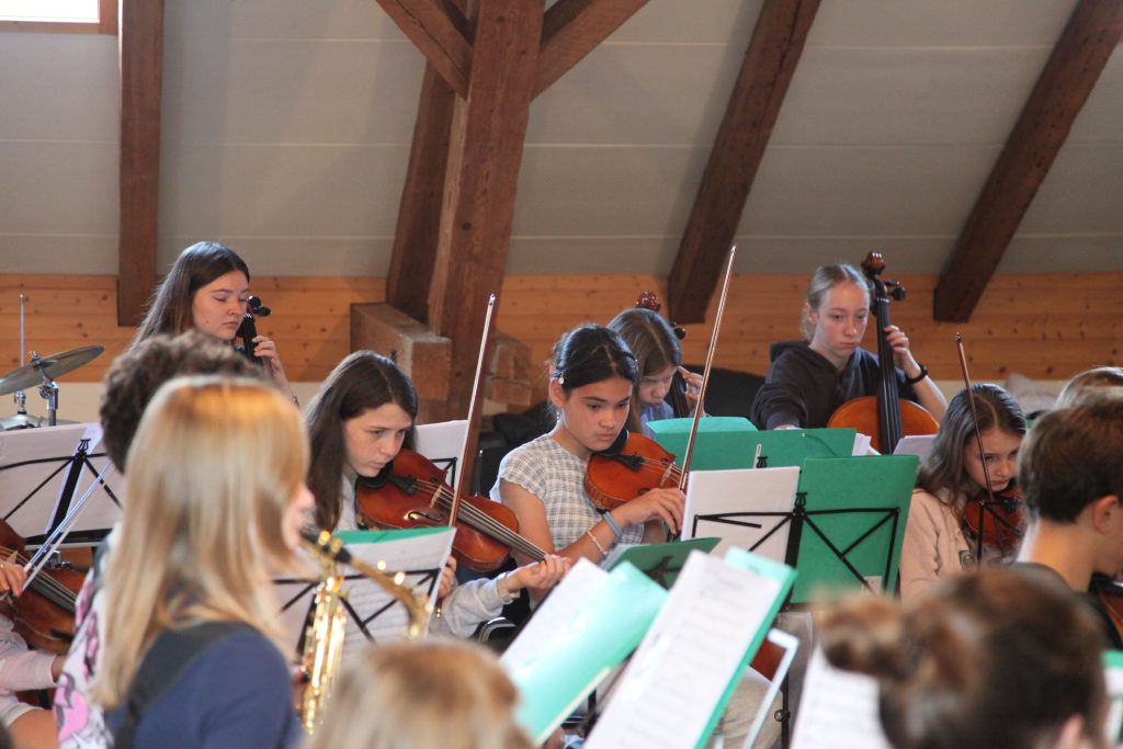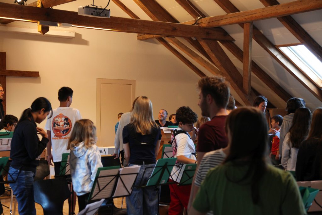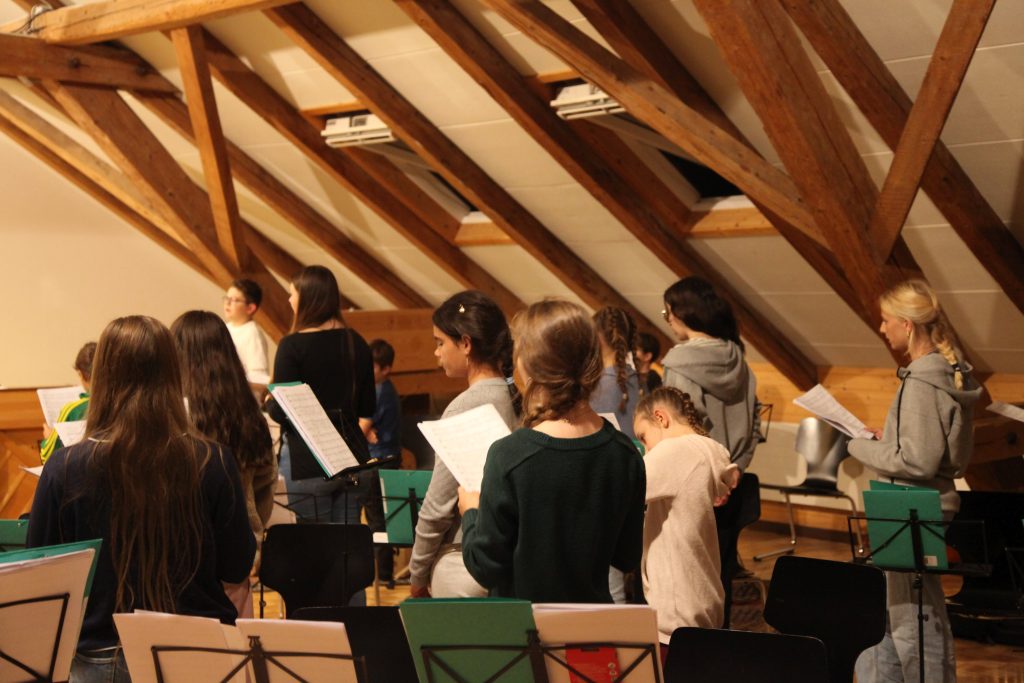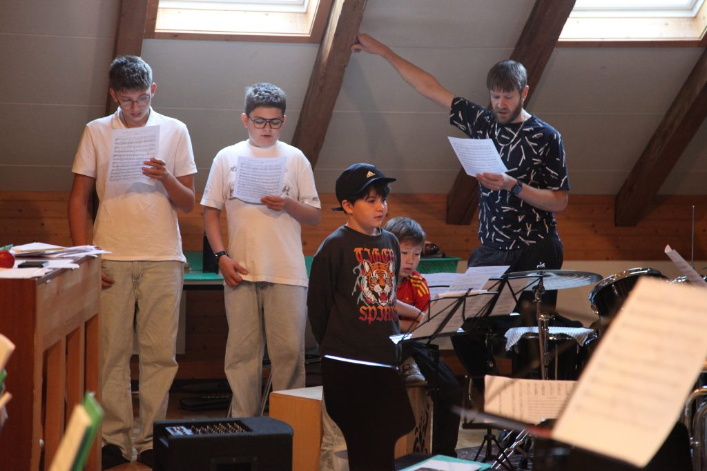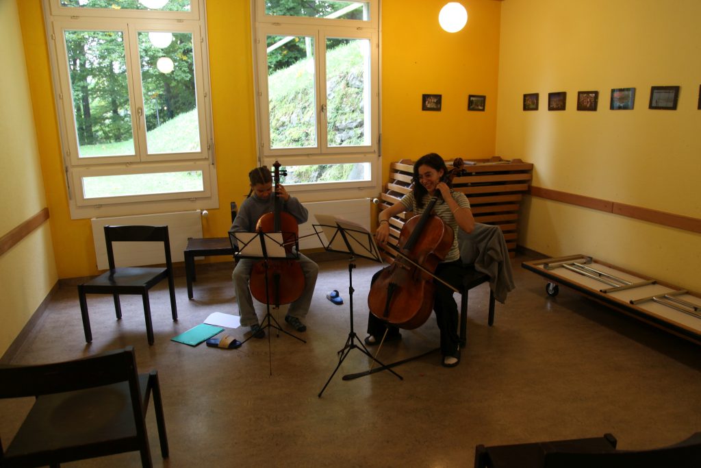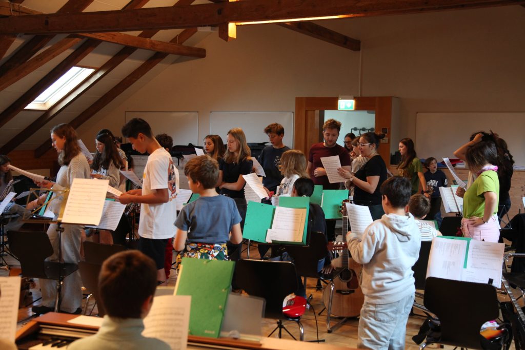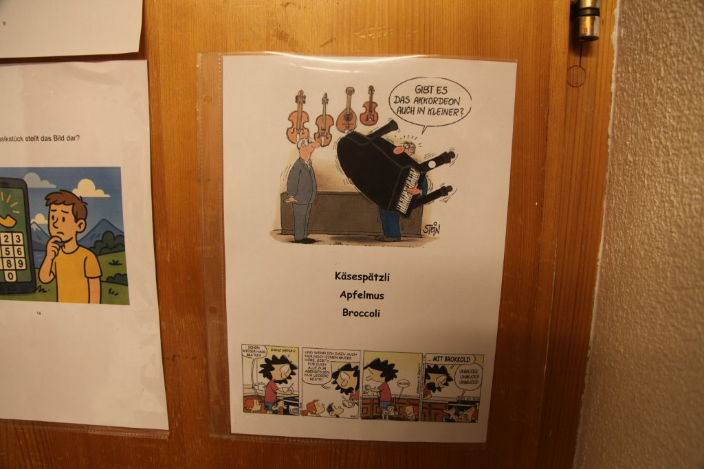 Eine kleinere motivierte Gruppe konnte sich abermals zum Morgensport überzeugen. Mit entspannter Musik wurde der Körper wieder bewegungsfähig gemacht und konnte dann mit poppiger Musik aufgewärmt werden. Das Morgenessen hatte abermals eine breite Auswahl an Optionen. In der Probe konnten die Teilgruppen nach dem Singen, jeweils den anderen präsentieren, was sie erarbeitet haben. Zudem wurde weiter an den gemeinsamen Stücken gearbeitet. Nun haben wir schon ein gutes Repertoire für das Abschlusskonzert aus Gesangs und Instrumentalstücken. Zwei riesige Bleche Käsespätzli mit Brokkoli und Apfelmus wurden uns beim Mittagessen serviert, die alle leer gegessen wurden. Mit gefüllten Bäuchen konnte aber trotzdem noch das kleine Dessert verdrückt werden. Am Nachmittag wurde nochmals kurz zusammengesessen um zu üben, während nachher die Fortgeschrittenen Gruppe ihre separaten Stücke probten und die anderen auf den Schulhausplatz gingen um Basketball, Fussball oder sonst den Kopf zu lüften. Zwei neue Stücke durfte die Fortgeschrittene Gruppe erarbeiten. Nach 20 Minuten war das erste schon gut durchspielbar. Die Probe konnte mit gutem Gewissen ein paar Minuten früher beendet werden. Der Nachmittag neigte sich dem Ende zu und das wunderbare Essen hat gerufen. Mit Lasagne und Caramel-Chöpfli im Magen wurden zuerst die Noten für das Konzert vorbereitet bevor es dann zum Quiz-Duell ging. Viele Songs und Fun Facts wurden erraten. Nach der Rangverkündigung ging es auch schon langsam Richtung Bett. Zzz..